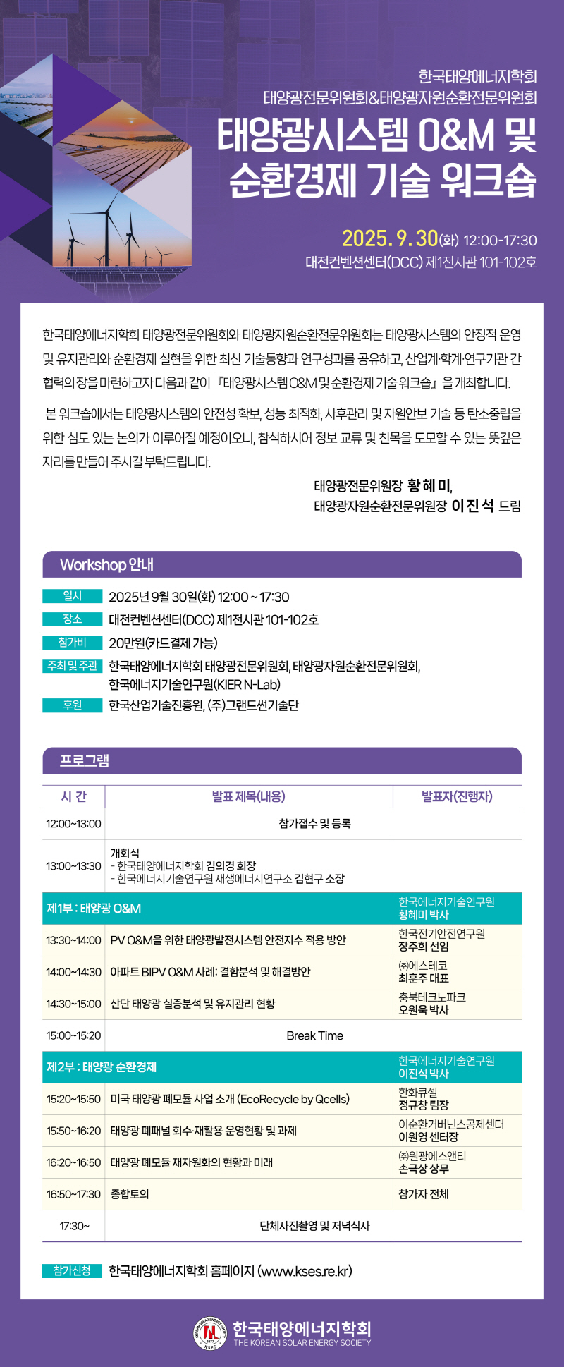 | 태양광시스템 O&M 및 순환경제 기술 워크숍 개최(9/30) |