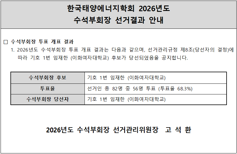 한국태양에너지학회 2026년도 수석부회장 선거결과 안내