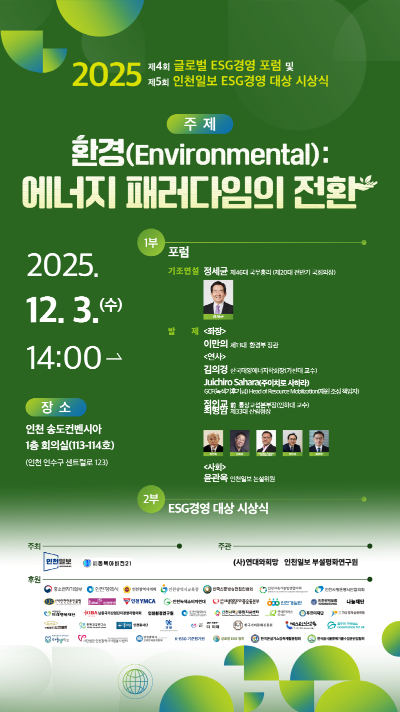 『2025 제4회 글로벌 ESG경영 포럼』 참석 ▶ 포럼좌장 : 이만의 전 환경부장관 ▶ 발제자 1 : 한국태양에너지학회 김의경 회장 ▶ 발제자 2 : GCF(녹색기후기금) 재원조성책임자 주이치로 사하라 ▶ 발제자 3 : 인하대학교 정인교 교수(전 산업통상자원부 통상교섭본부장) ▶ 발제자 4 : 최병암 전 산림청장(33대) ▶ 내 용 : ESG경영포럼에 참석하여 "정부와 지자체의 에너지정책을 연계한 ESG추진방안" 발제 ※ 자세한 내용은 첨부파일의 대외활동 보고서 참조