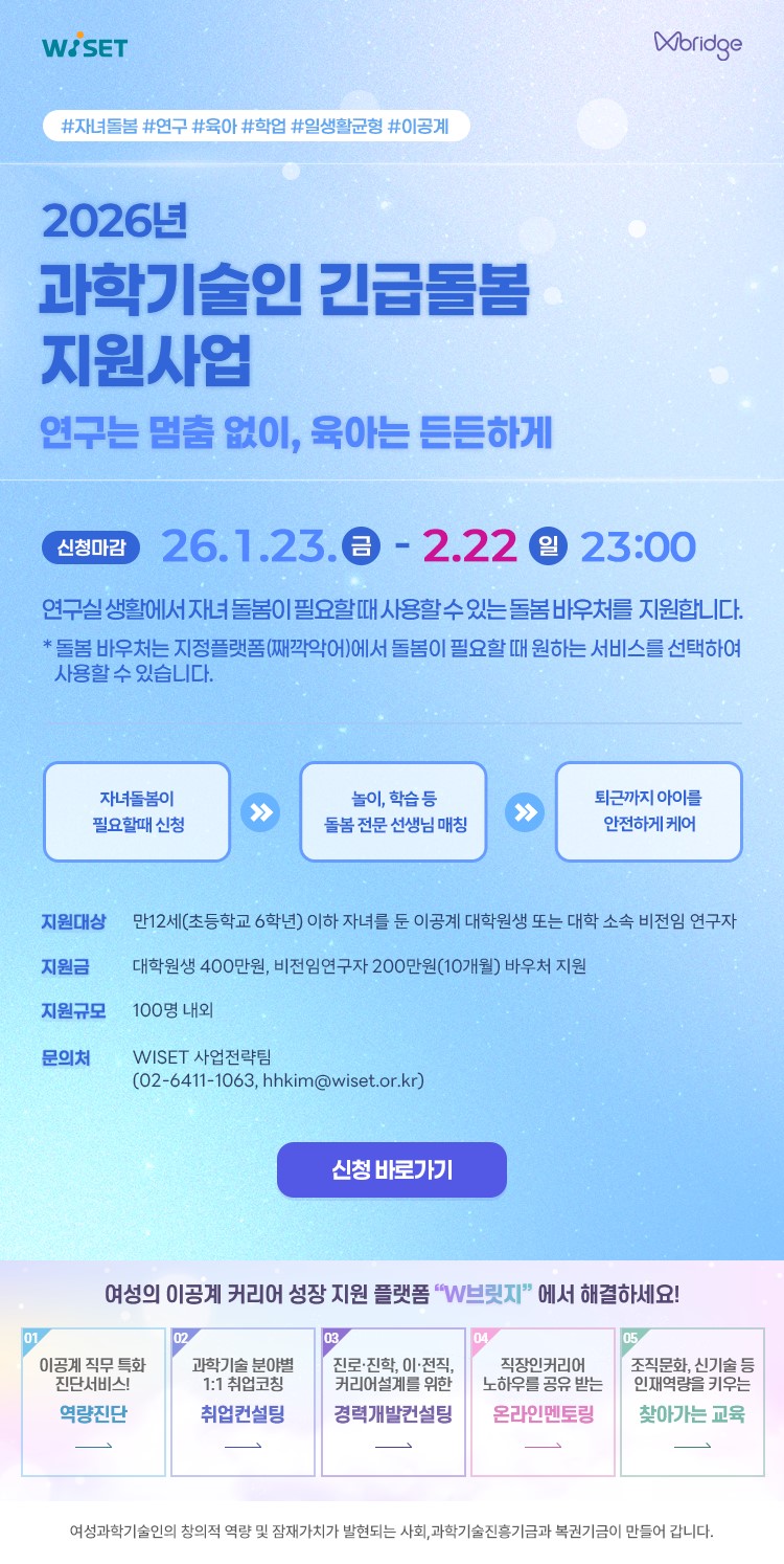 [WISET] 2026년 과학기술인 긴급돌봄 지원사업 참여자 모집 안내(~2/22)