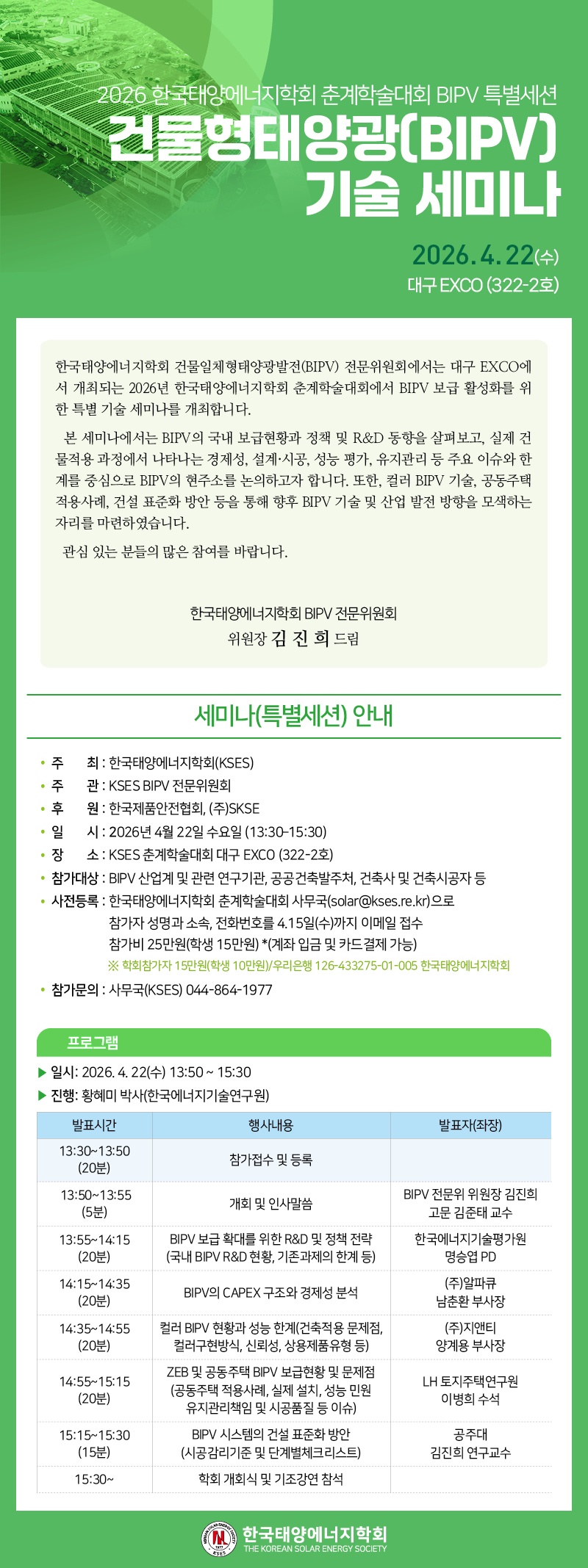 안녕하세요? 한국태양에너지학회 BIPV전문위원회에서는 아래와 같은 내용으로 『2026 건물형태양광(BIPV) 기술 세미나』를 개최합니다.